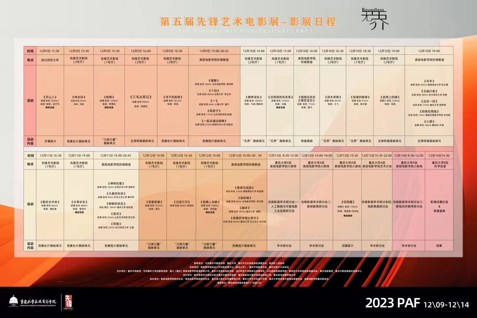 本届先锋艺术电影展线下主体活动于2023年12月9日至12月14日举行,展映包括剧情片、纪录片、动画片、实验影片等多元形式类型影片,同期将开展多场学术论坛与研讨会,共同探讨当下的影视问题与未来发展。先锋艺术电影展起始于2018年,至今成功举办四届。