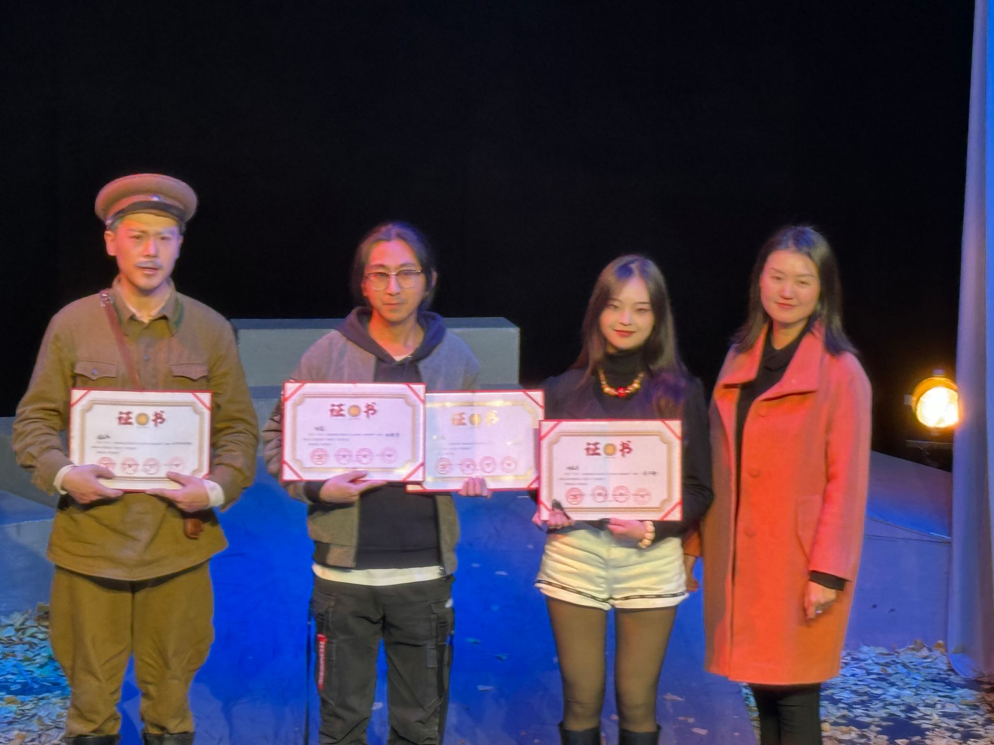 副教授赵虎老师带领2022级研究生江山杉、黄茜茜共同编剧,赵虎老师导演,学生杨璐为副导演,联合舞美设计李云靖老师、伊继平、张周艺楠同学,服化设计高静老师,灯光设计于睿老师、刘高屹同学等人共同完成。《这里的黎明静悄悄》在展演剧目中脱颖而出,获得 “优秀剧目奖”,演员琚嘉辰同学凭“瓦斯科夫”一角获得“优秀演员奖”。