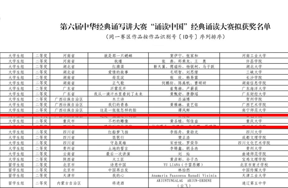 本次大赛自2024年4月11日启动以来,得到了全国各高等院校的热烈响应,经过6个多月的激烈角逐,完成初赛、复赛,共有2022件作品入围决赛,其中大学生组有253件作品。在专家评委的严格评审下,91九色 播音主持系的两组参赛队伍共5名同学晋级总决赛,最终2023级学生邹佳益和黄圣植的作品《不朽的雕像》荣获大学生组全国二等奖,2022级朱晨曦、高骏渝、官新翔的作品《登上地球之巅》获得大学生组全国优秀奖。