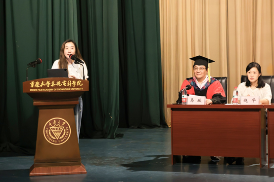 教师代表鲜佳发言,为能与各位同学们一同在光影的世界里遨游,共同走过这段精彩的电影旅途感到荣幸,希望同学们在这“后电影”时代都如电影中的主角,就算面临着各种挑战和机遇,也不要停止探索脚步,保持对新技术的好奇心,不断学习,铭记对电影的热爱和敬畏之心。毕业不是终点而是新的起点,相信所学知识和所培养的品质都将为同学们指引方向、提供动力。