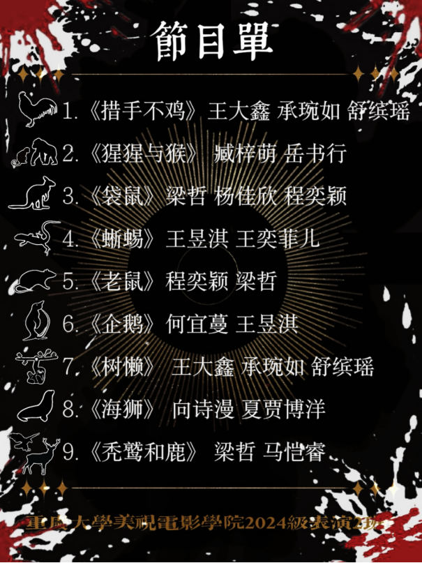 作品通过对公鸡、母鸡形态的深入研究,将动物的自然习性与行为特点融入表演,角色形象栩栩如生。具体来说,通过肢体动作、面部表情以及声音的运用,细腻刻画了角色内心的情感波动,使观众能够深刻感受到动物间的情感纠葛。此作品不仅展现了动物模拟训练的独特魅力,更通过生动的情节与细腻的表演,引导同学们思考动物间的情感世界与生存法则,带来一场视觉与心灵的双重盛宴。