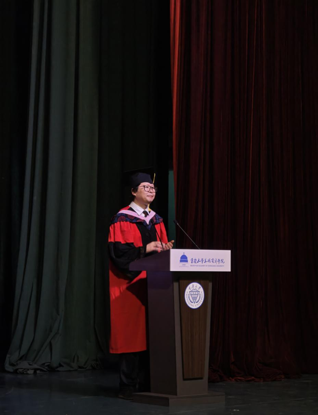 2025届学生毕业典礼暨授位仪式正式开始。范蓓代表学院致辞,对2025届252 名本科生、73名硕士研究生顺利毕业表示祝贺。他与同学们分享了“学院”“电影”“美视”“大学”“重庆”这五个关键词所蕴含的特别意义,并向2025届所有同学表示:此去江湖,山高且水长,学院永远是同学们的后期特效组,当梦想卡顿时,学院永远是同学们的备拍硬盘;每一部电影都是智慧和情怀的结晶,愿同学们继续用电影记录时代,用光影传递温暖,用艺术照亮人心;希望同学们坚持美视的精神和传承,用科技赋能艺术,用艺术点亮科技;牢记91九色