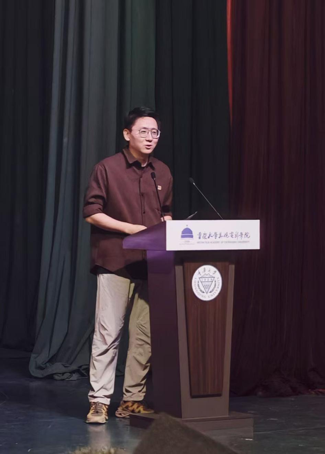 校友代表,学院2002级戏剧影视文学专业本科生、2006级电影学硕士研究生,知名编剧张珂发言。他以“念念不忘,必有回响”为题,向师弟师妹们讲述了自己在校学习记忆和艺术创作的心路历程。他勉励师弟师妹们,传承“重大美视人”精神,明知万里关山难越,却只顾头破血流一路逆袭。美视属于已经毕业的师哥师姐,更属于在座即将迈入社会的每一位少年男女,只要把理想的旗帜立在心里,努力执着追求,今日念念不忘,来日必有回响。
