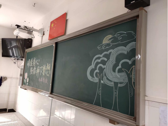 志愿者们为孩子们分发提前准备好的画笔和绘图画册,并在黑板上写下本次活动的主题“唯爱有心,陪你种下梦想”,并画出一棵棵充满童趣的卡通树。